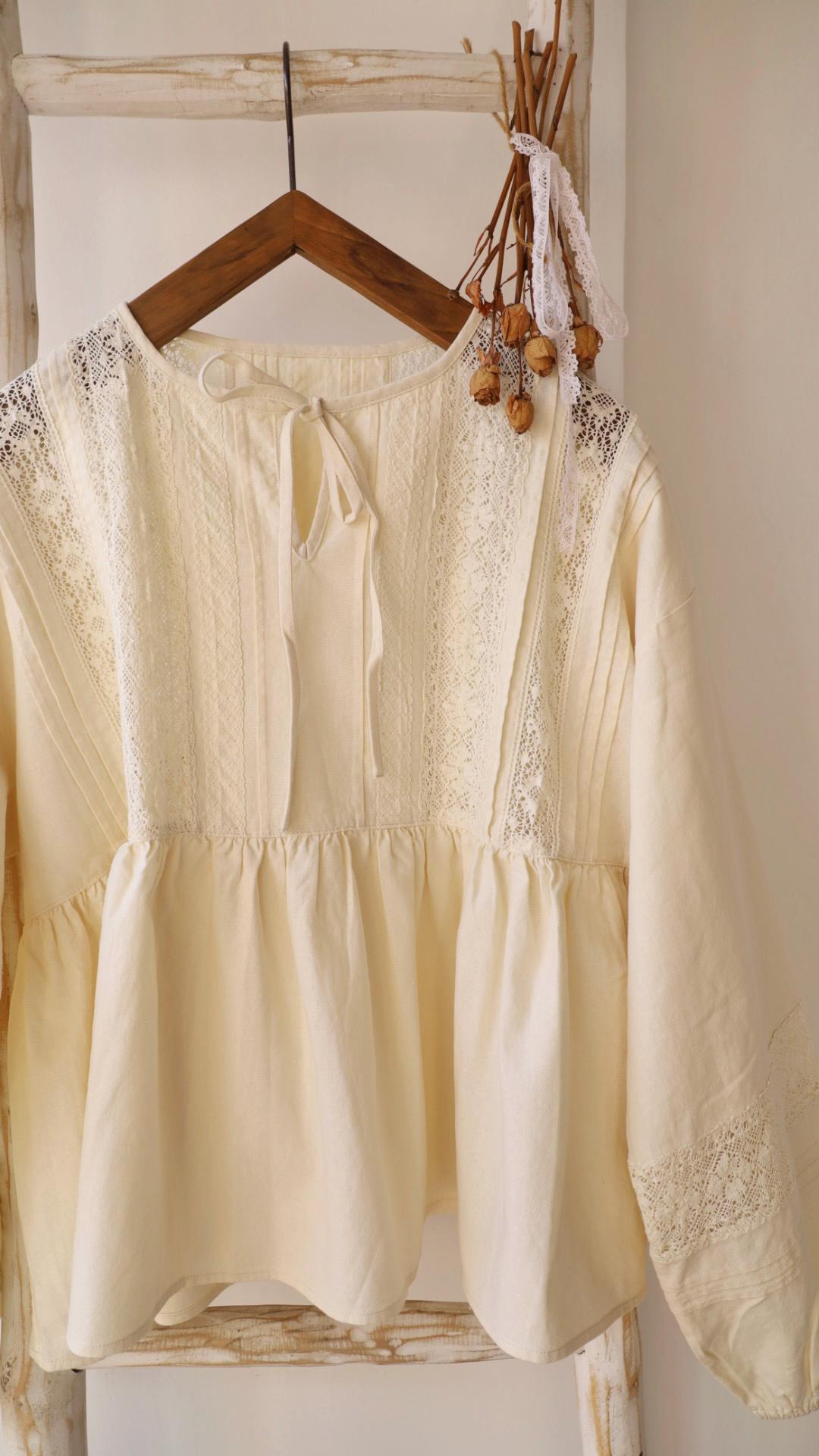 This is a cotton and linen mixed blouse, with delicate lace in front and back .