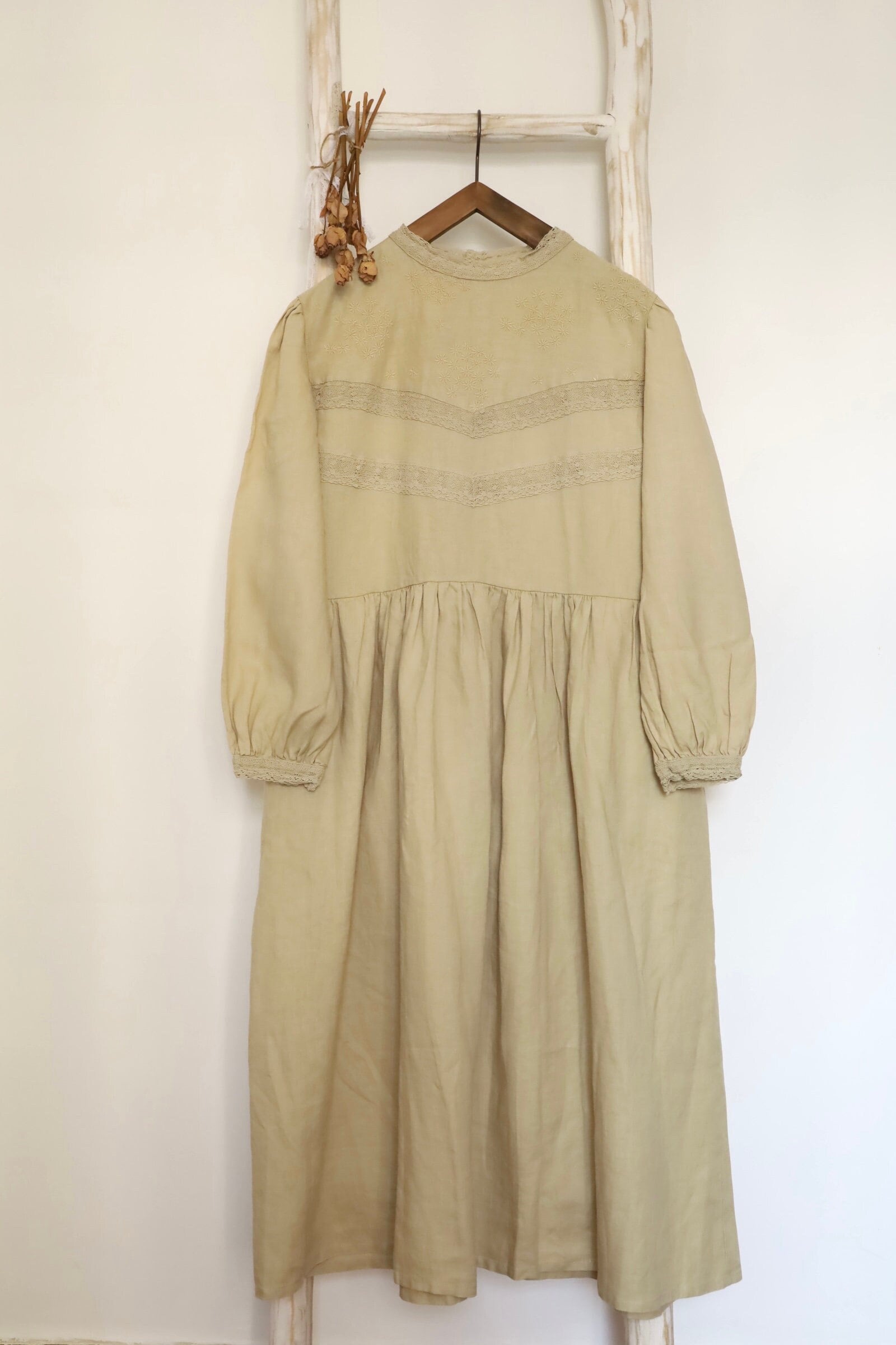 Handmade Linen Dress: Cream White Vintage Style with Embroidery