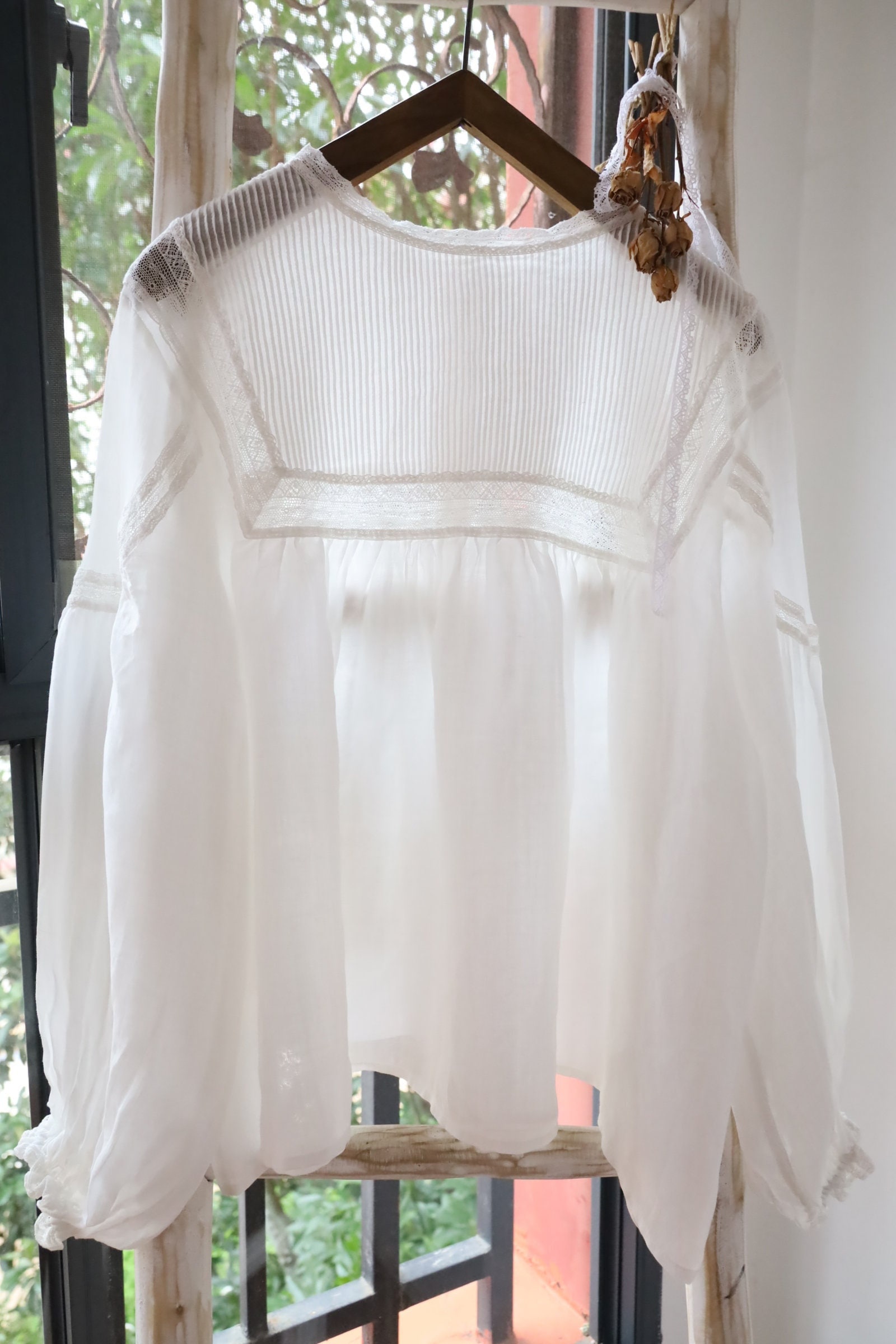 This is a very delicate and elegant blouse. Lots of pleated decoration on the front, and the sleeves are bishop style. It is highly recommend. White and black color available.