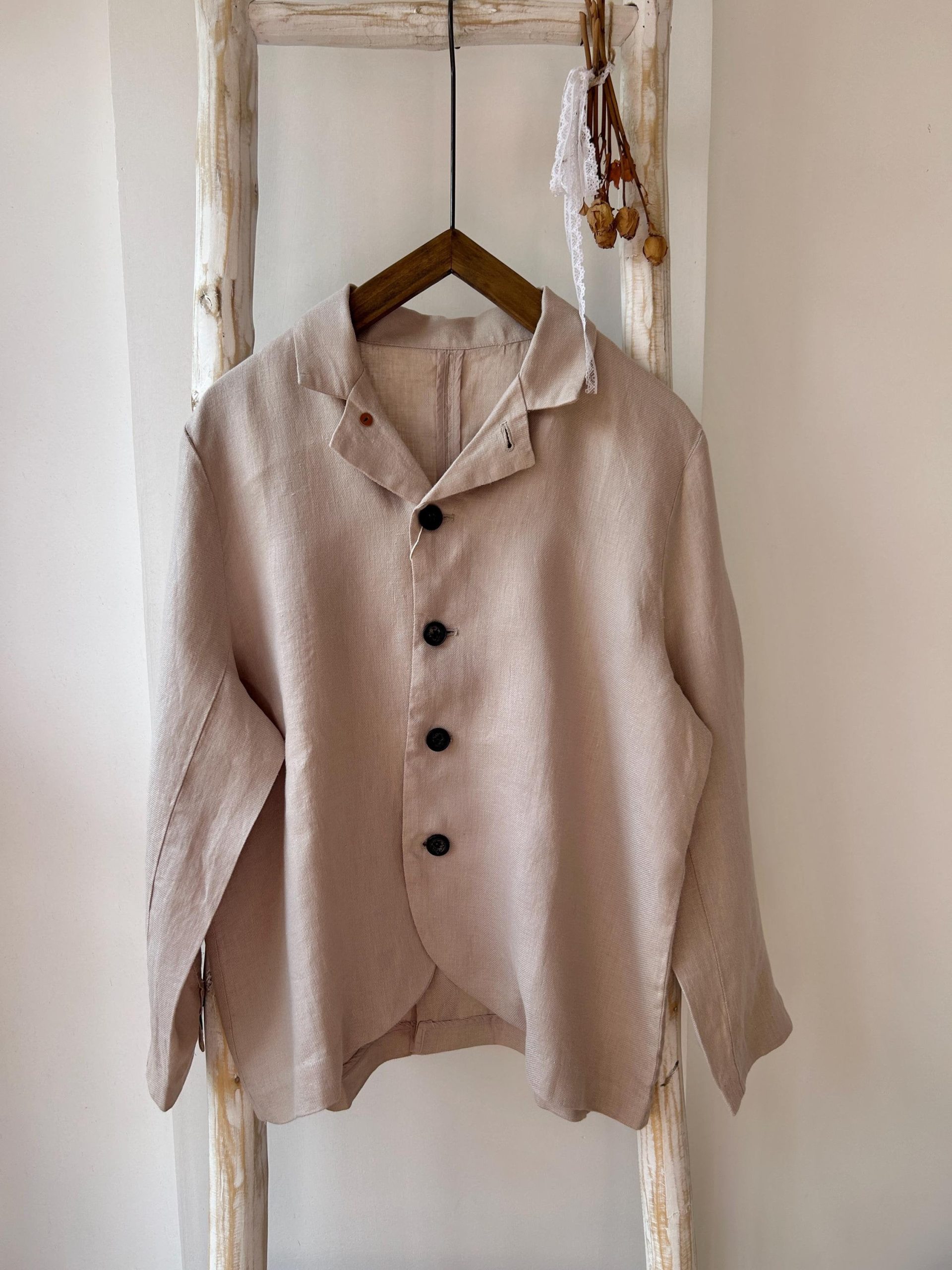 This is a special made linen smart casual jacket/ coat. It is suitable for all the casual occasion. The touch is soft, thin, and light. It would be perfect for matching dress or shirts.