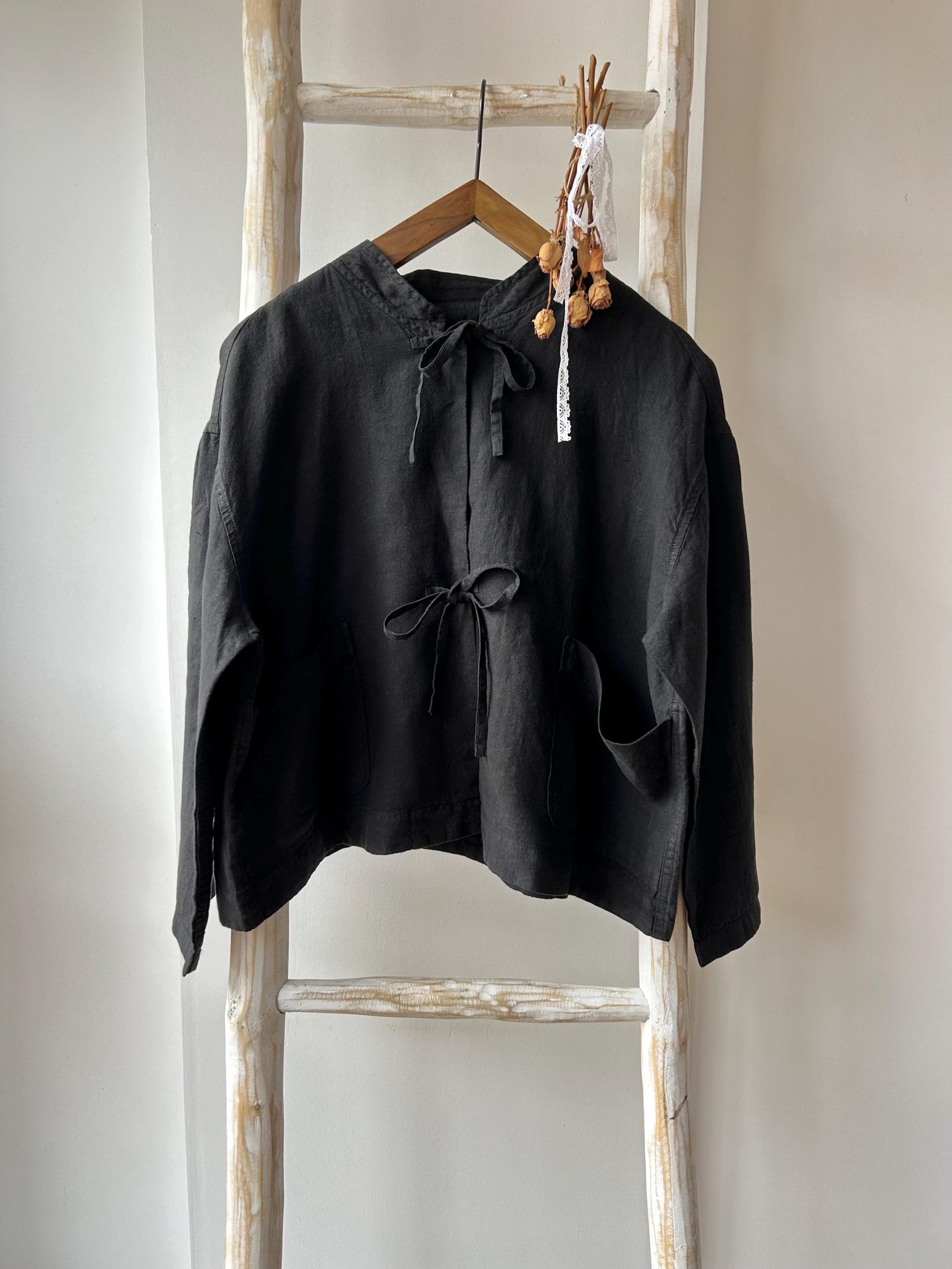 100% linen jacket decorated with bow ties. 2 colors available. Black and photo red color.