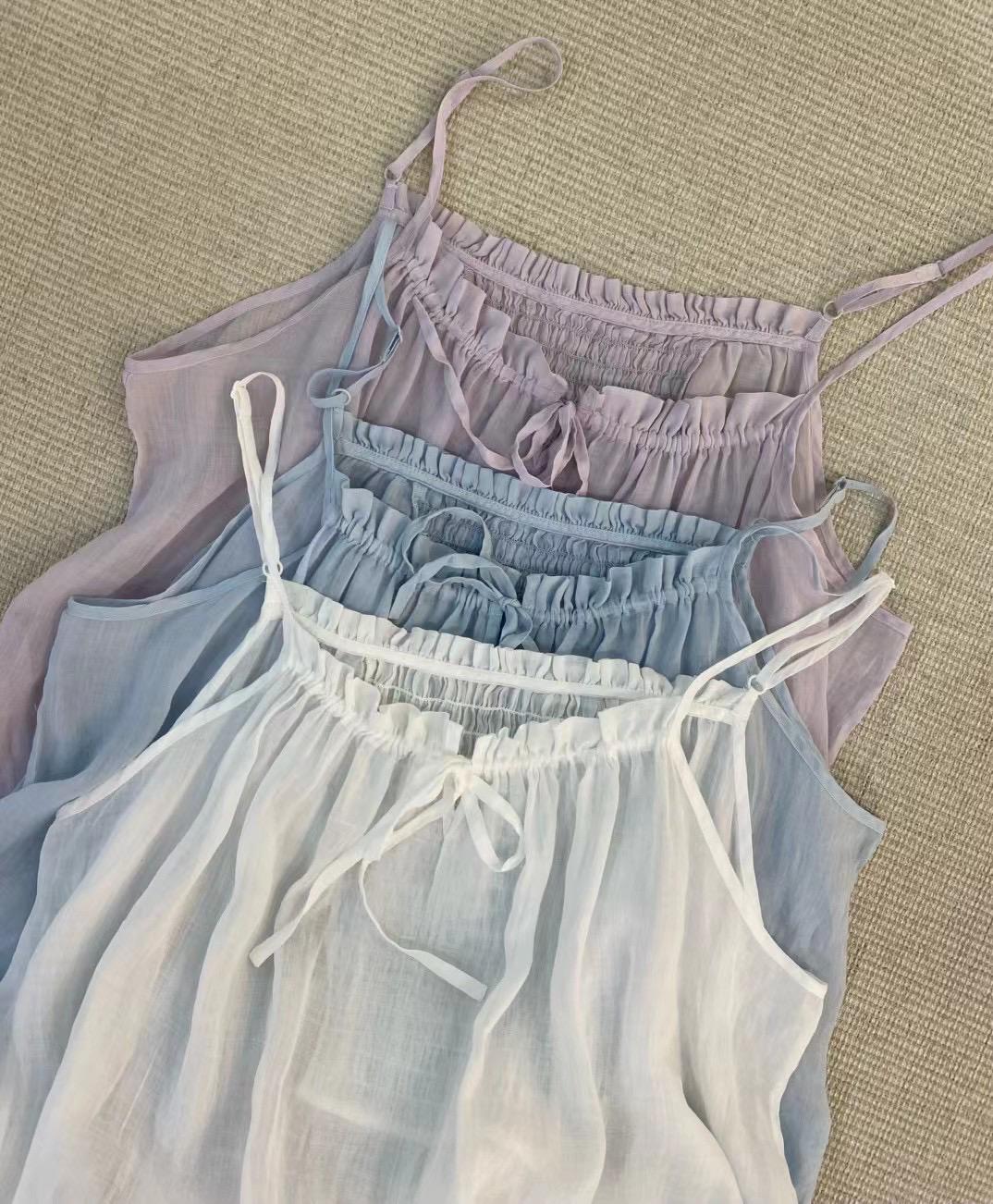 It’s a new hand-made ramie strap dress. This camisole dress can be styled in many ways. It’s the perfect choice for the beach — wear it over a swimsuit for an effortless vacation look. You can also layer it over a T-shirt or even wear it on top of another dress for a creative layered outfit.