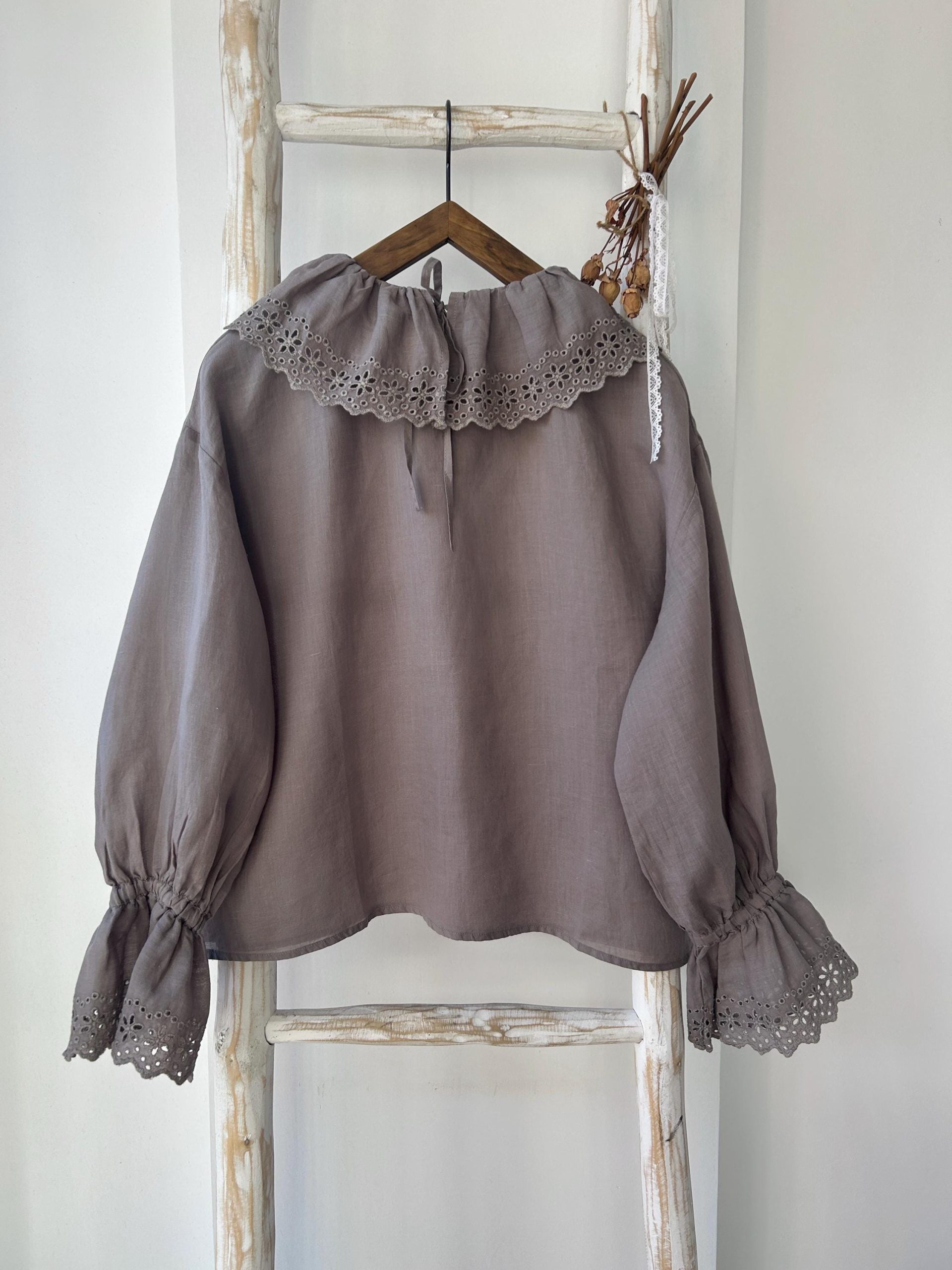 This blouse is made from soft, breathable ramic fabric, featuring a romantic decorative collar.